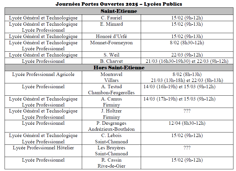 ATTENTION - Une erreur s'est glissée dans le planning des portes ouvertes des lycées : la journée des portes ouvertes du lycée Honoré D'Urfé aura lieu le samedi
